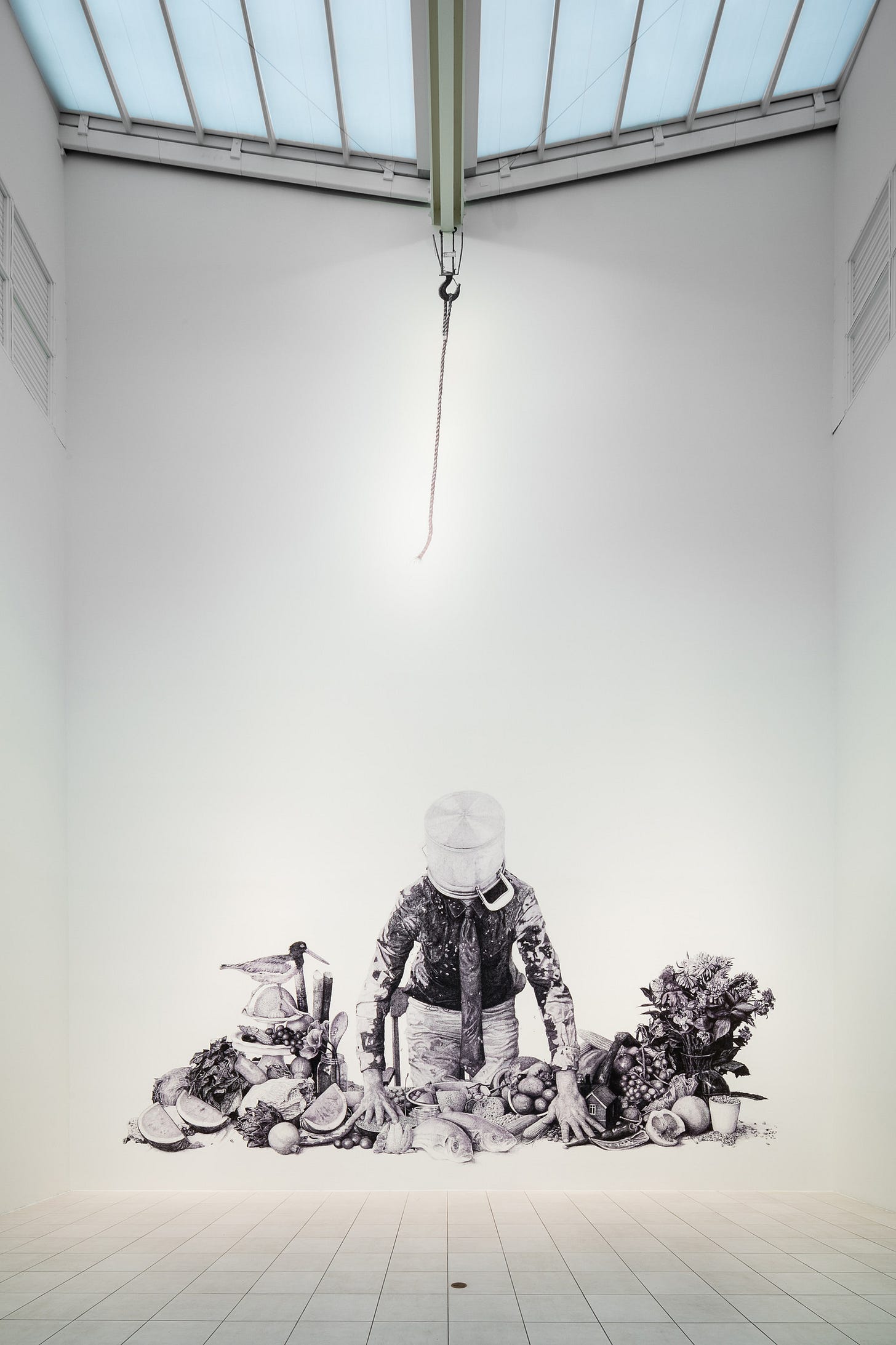 Murrow’s mural is a still-life feast filled with all the trappings of a Martha Stewart cornucopia, plus the inclusion of a figure. An imposing figure at that; reaching over the table laying claim to the bounty. Scroll back up and look at the top of the wall drawing.