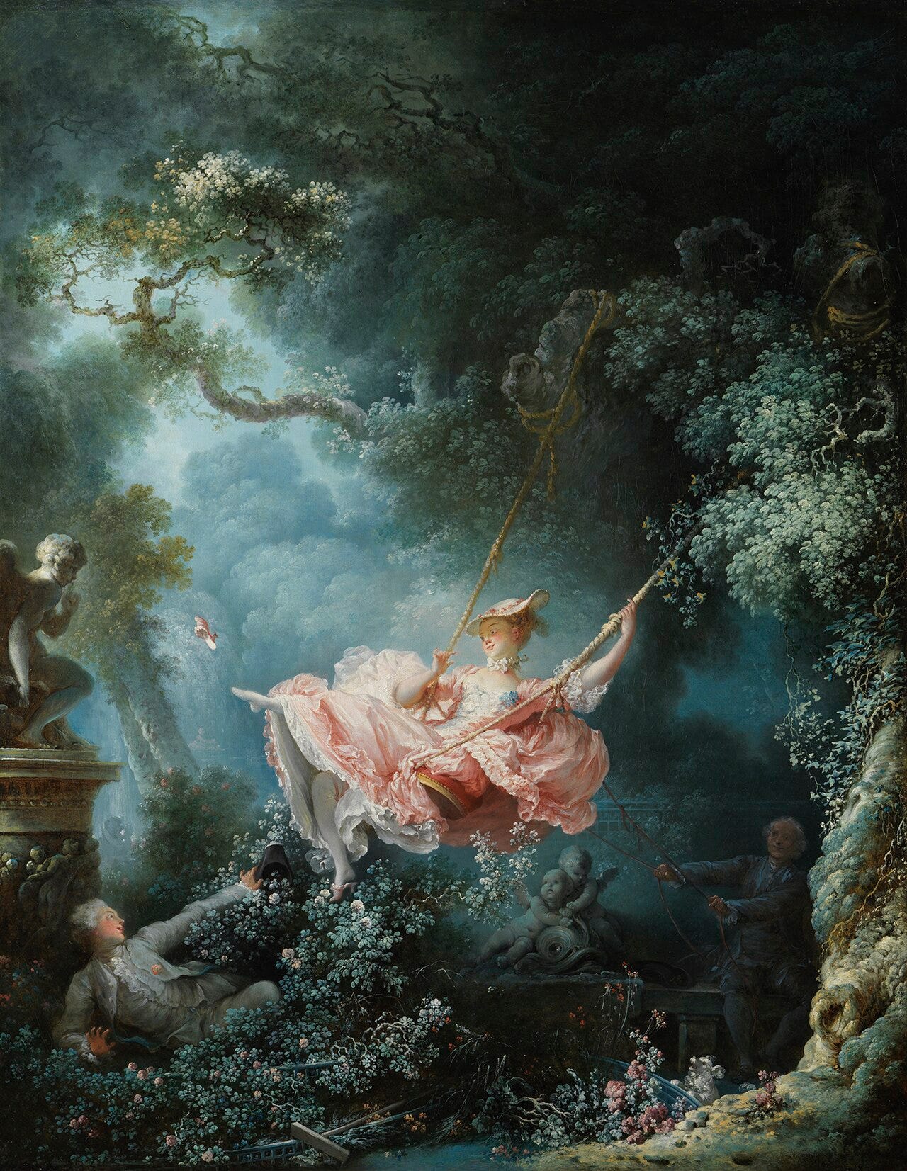 The stunning skill of beautiful brushwork draws my gaze aloft until… What on earth is that dude doing down in the bushes? Well, his eyes are being directed toward higher things, I suppose. In case the FT audience is too naive, let me spell it out for you: he’s a peeping Tom, and apparently he’s peeped quite the elevating sight!3 Like most Rococo art, it is not meant to elevate but titillate.