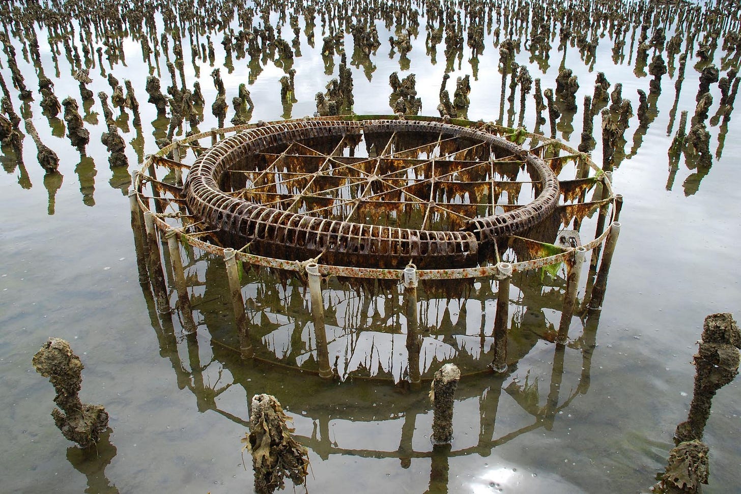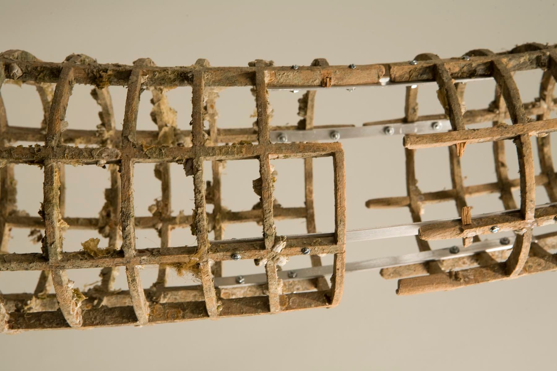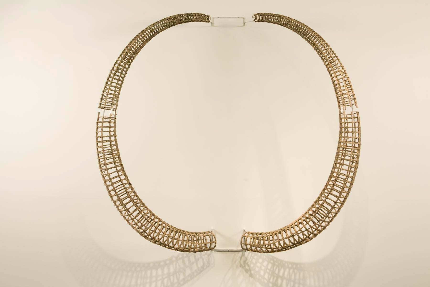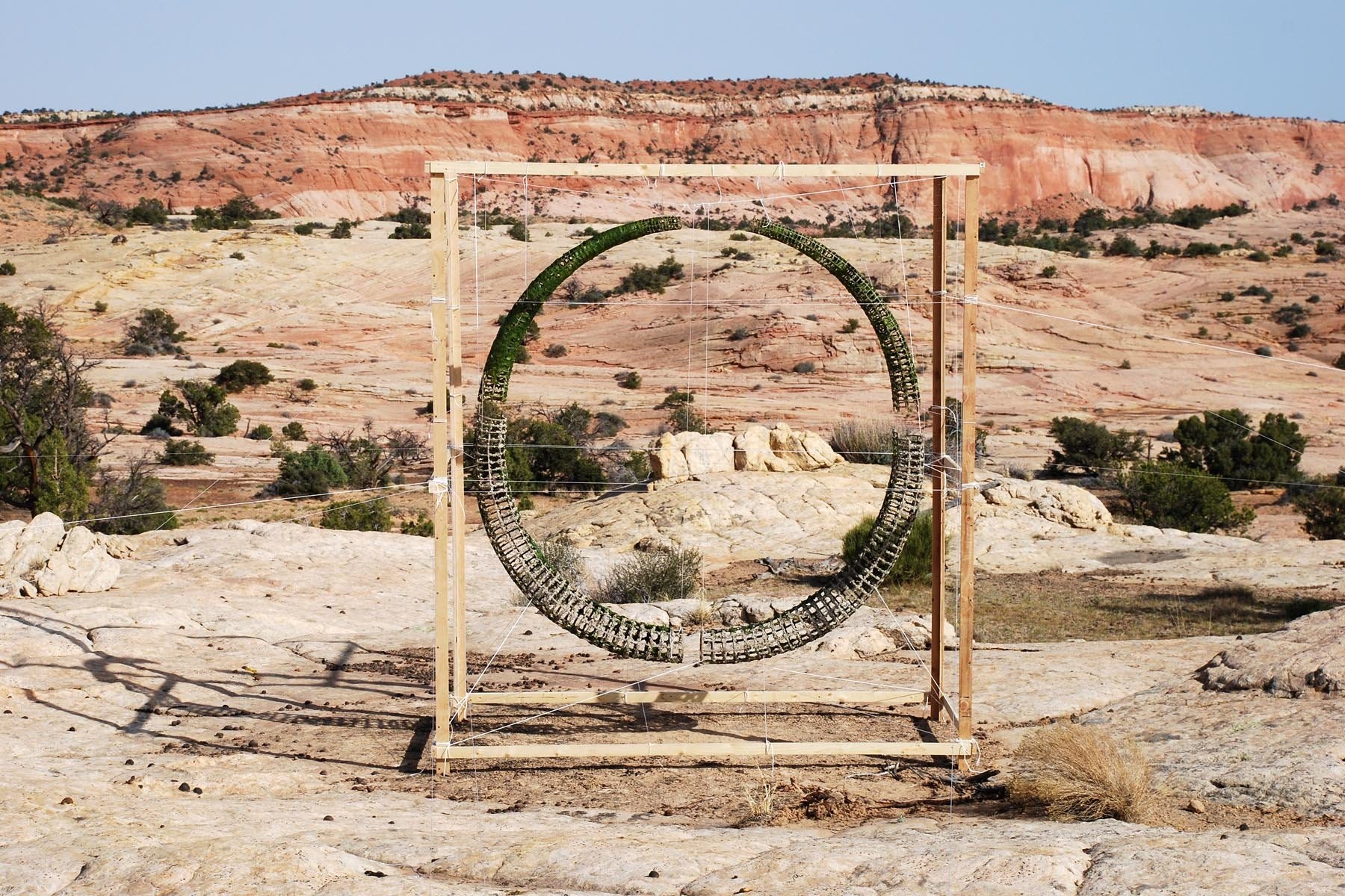 Grade constructed a split circle of wooden lattice which he carried out into a variety of wildernesses and left it to weather the elements. He submitted it to the seasons and patterns of nature. It was submerged in water: