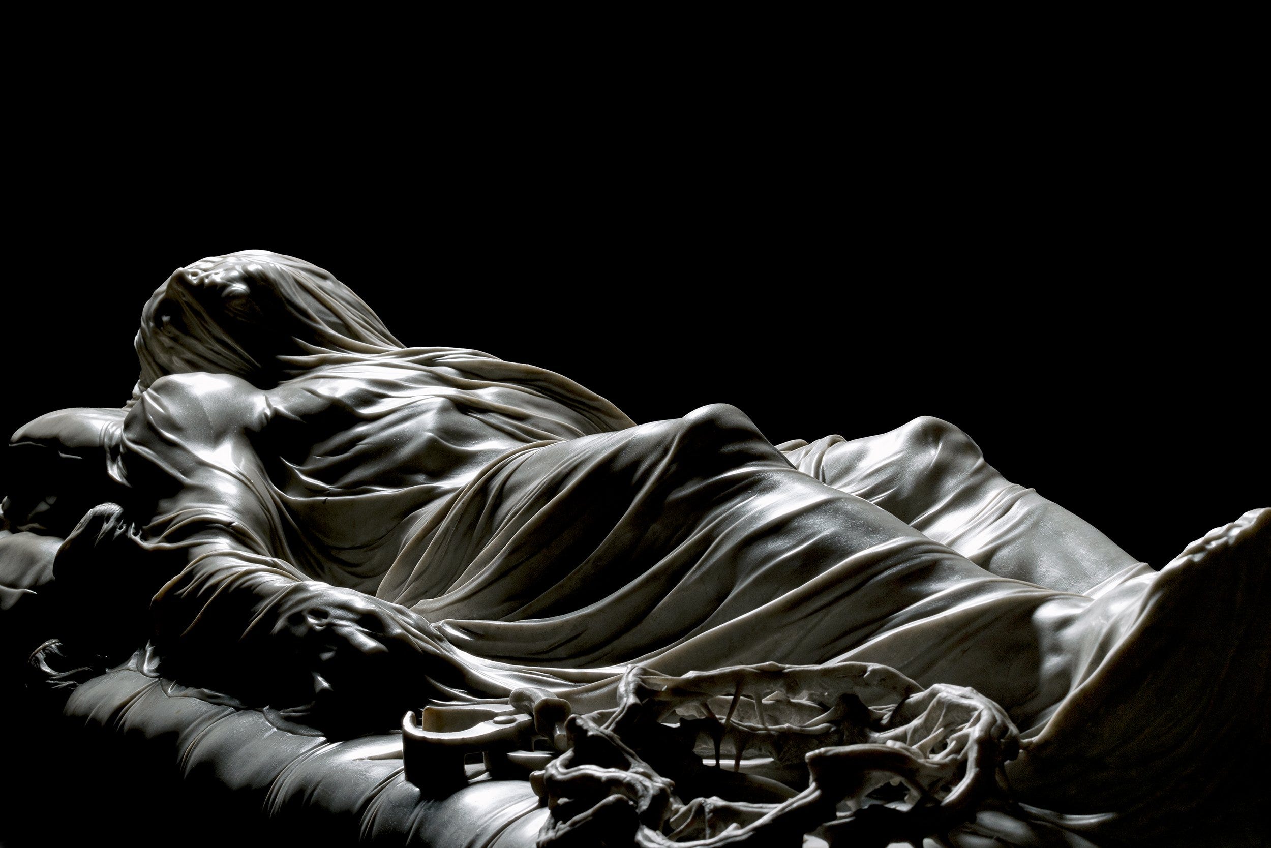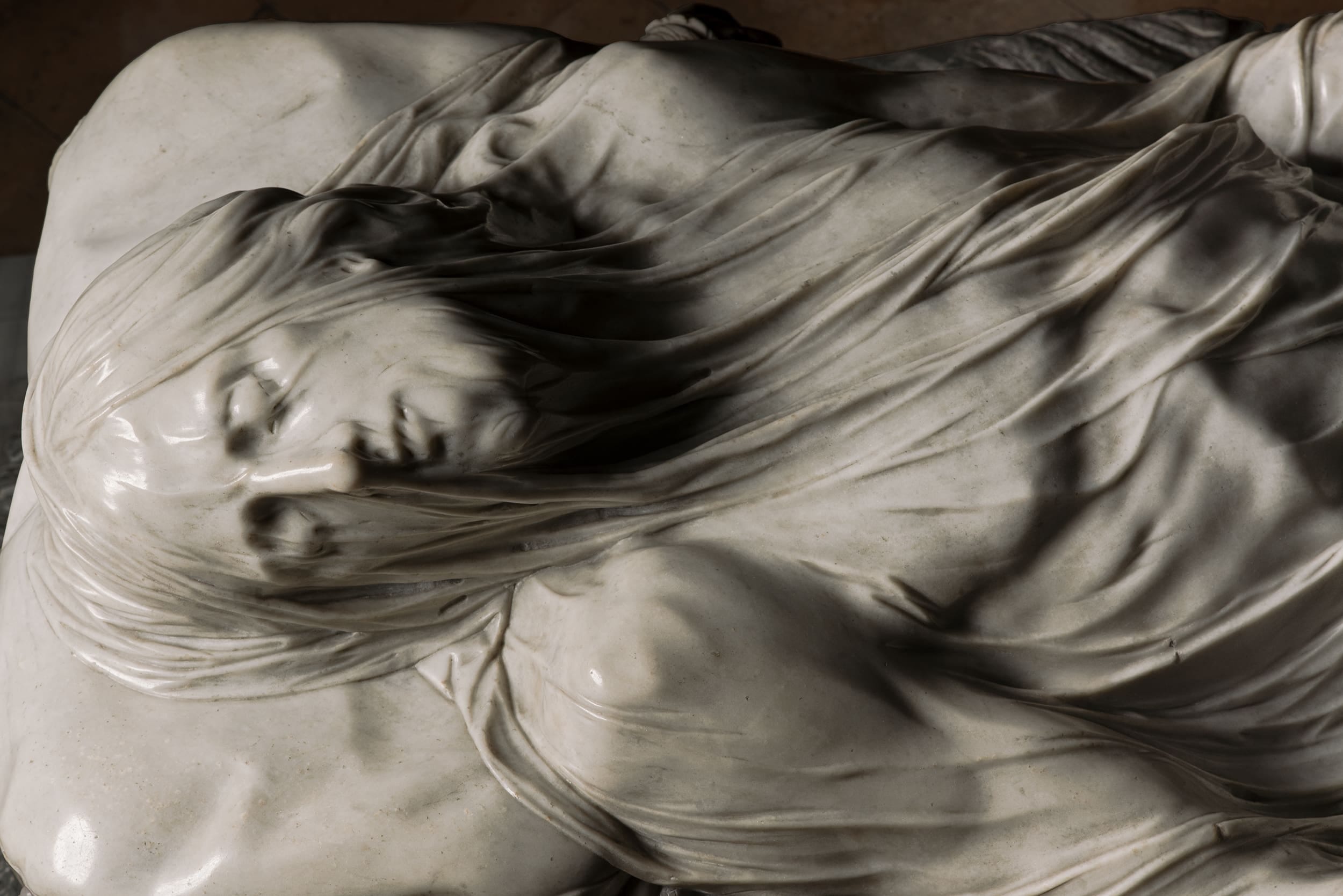 The funeral veil shrouds the body. The details blur, especially in Sanmartino’s sculpture, and we begin to see the general shape of the person. We no longer gaze on the living face but rather see the body mixed with the flowing fluidity of the veil. Sanmartino’s skill is incredible! The funeral veil directs us away from the body and towards a remembrance of the lost one’s life.